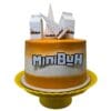 Este cake design exclusivo apresenta as cores e a identidade visual MiniBuh, com detalhes criativos como miniaturas de caixinhas e o logo em destaque.
